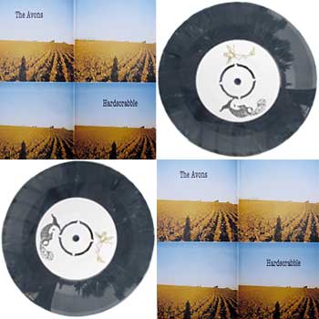 Grayish blue mixed colorblob vinyl 7", hand stamped side notification markings, and golden Avons symbol of authenticity on record, one-sided color insert.