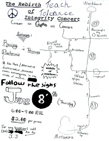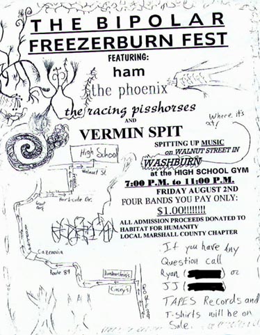 we made this flyer for a big concert we had at the Washburn fesitval. yes, that's where we're from. we had a really fun time, and sold the tape that ended up in the hands of makeshift dude-man mike richards. concert exerpts available on this budget cassette