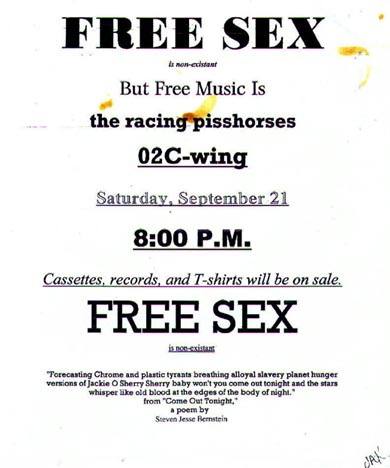 this flyer is from our second show the summer of 2001, at the PCW in Spring Valley. played this new medley of amorphous bathing and an unreleased tune, "lawnmower." we were moving from tuning in between songs for decades (like we did at the first Zarathustra) to starting the next song before stopping the first. for our third show that summer, we finally did just that, playing our 12 song set in 45 minutes with just one interruption. unfortunately, JJ had to go back to school. our first show that summer was also at the PCW wrestling place, only that time we actually played in the wrestling wring in 100 degree temperatures. it was so much fun, but there was no ground for the mic so JJ kept getting some lip-shock. finally he put a stocking hat over the stupid thing, taking the shock away but adding to the heat. lotta sweaty fun, though. as far as we know, this was cory's first show with the pisshorses. more from the rebekahs tape part of the show.