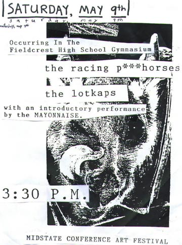 This was our last concert for more than a year. The opening Mayonnaise chased most of the audience away, with half the remaining audience related to JJ. JJ was pretty pissed actually at these two crazy cats, one twisting knobs, the other jumping on an overdriven toy keyboard while apparently smacking some sounds out of a bass. astonishingly full of no commercial potential. the pisshorses still had fun thou, Our PA was loud, and we screamed with frustration and happiness. mike broke a drum head playing foxy lady. reminiscent of that silly birthday jimi hendrix medley, JJ taught ryan a new song from a tape in his car (Politician) which later ended up as a staple of the pisshorses live show. although nobody was watching, we had a damn fun time playing on this little stage in the middle of Minonk's high school gymnasium. more recollections from the Mayonnaise/Lotkap side
