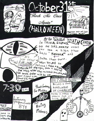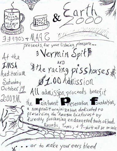 aldo quintanar drew up this flyer for our first concert (one of only two, the other being in this scary basement) with Drew from Vermin Spit. aldo filmed the show, as we performed in the IMSA auditorium with a bunch of theatre props laying around. writhing fun.