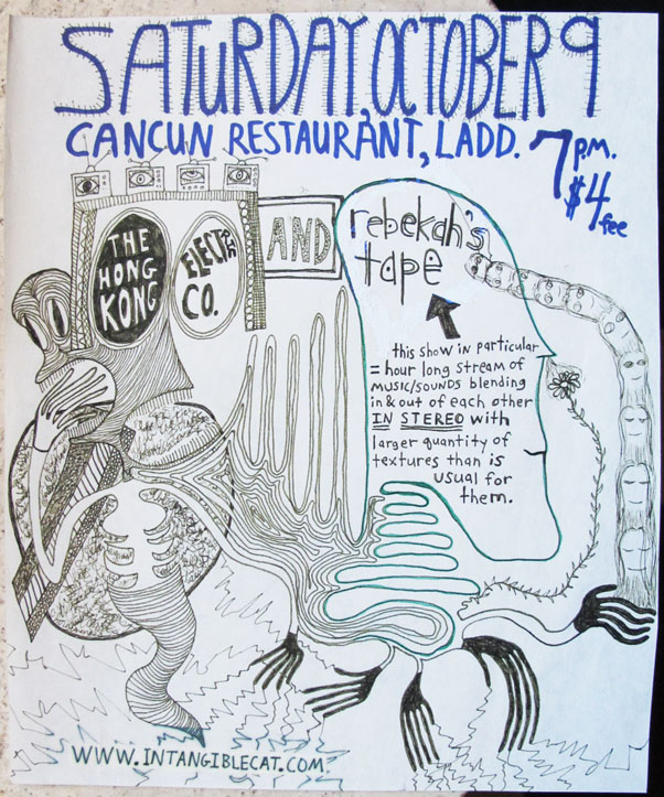 This is the flyer Mike drew for the performance that tracks 1, 8, and 9 are taken from. Phil Klampe of Homogenized Terrestrials was nice to record the entire performance for us. The Hong Kong Electric Company's performance this night was highly entertaining, featuring the gigantic mustache as usual, preposterously obsessive and frequent puffings from a huge cigar, and debut of one of our favorite pieces of theirs; "beastiality", which features a delightful call-and-answer segment where the audience is solicited to make various animal sounds.
